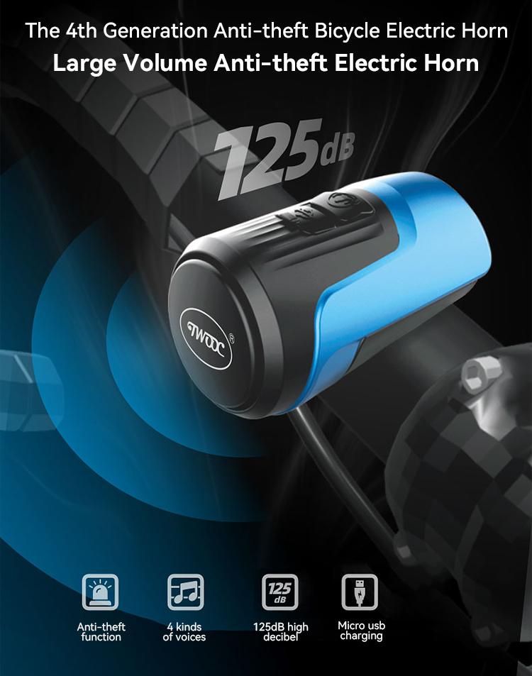 Bicycle Bell IPX5 Waterproof Rechargeable Electric Bike Horn with Anti-theft Alarm Function